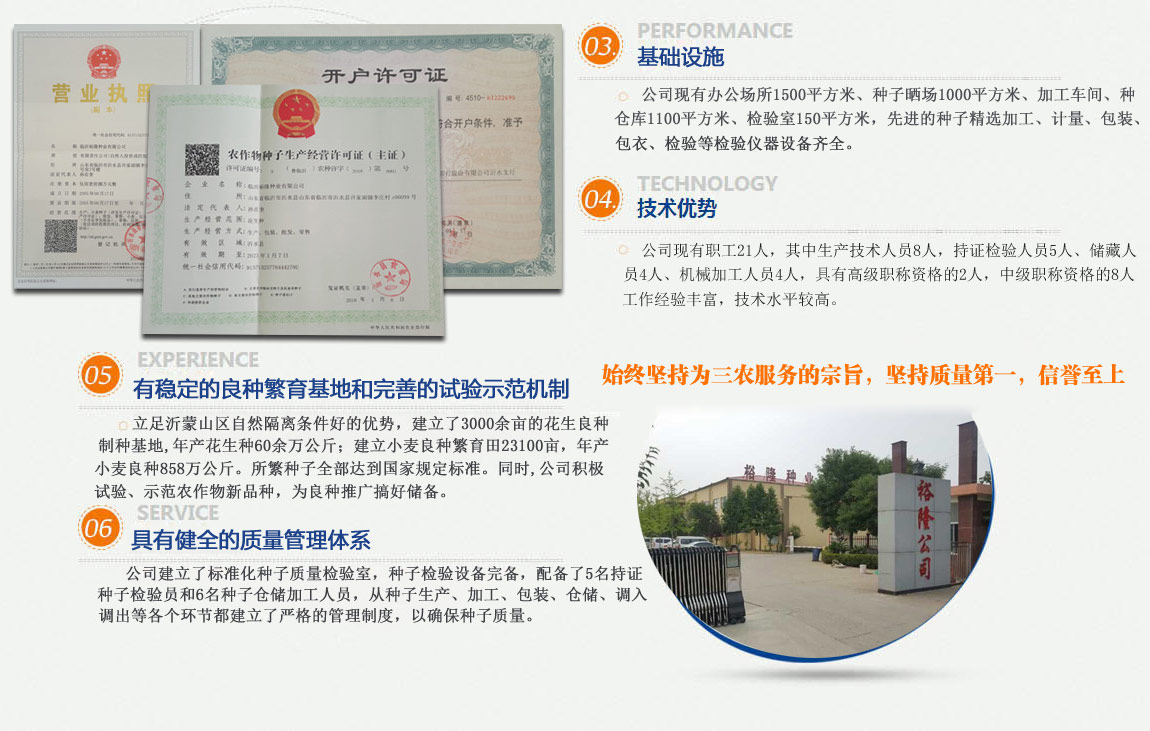 臨沂裕隆種業有限公司成立于2005年,是一家集主要農作物種子生產、經營于一體的民營企業。公司成立以來,立足當地優越的土地、氣候、自然隔離等優勢條件,以發展小麥、花生、蔬菜良種繁育為主,同時代理經營玉米、化肥等農作物良種及肥料。目前主要經營各類花生種子,小麥種子,玉米種子,蔬菜種子及專用復合肥料。